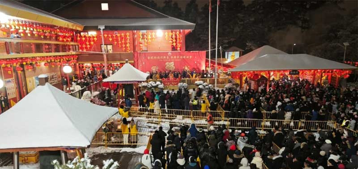 除夕夜至黎明时分,湛山精舍不眠不休地迎接着十方信众上香祈福、敲钟许愿。纷纷扬扬的细雪温馨洒落,寓意着瑞雪兆丰年。广场上排队等候敲钟的人群宛如长龙,蜿蜒不绝;新年钟声悠长绵延,向大众传播着智慧与祝福,为世人在新的一年带来无尽的希望与光明。