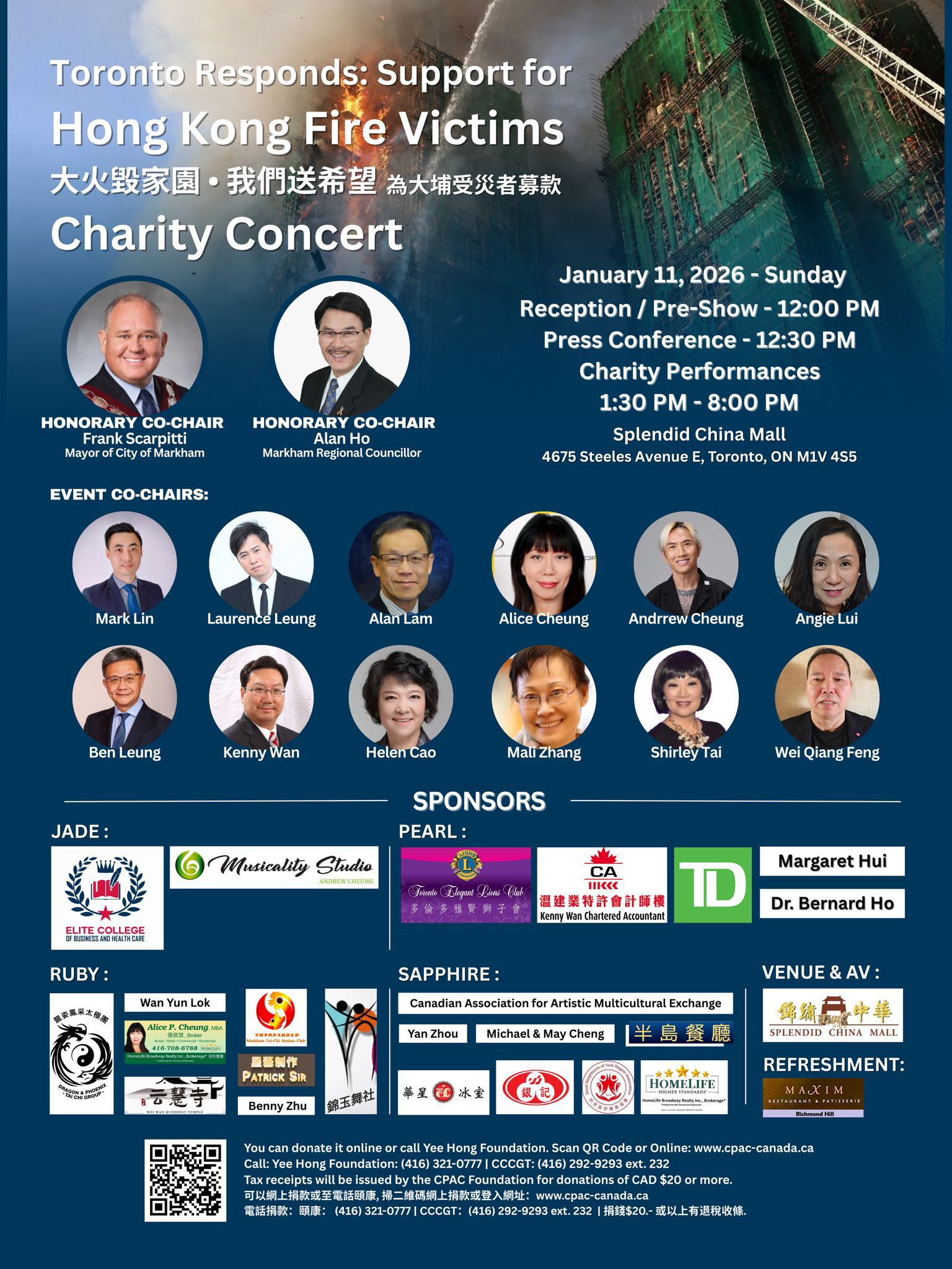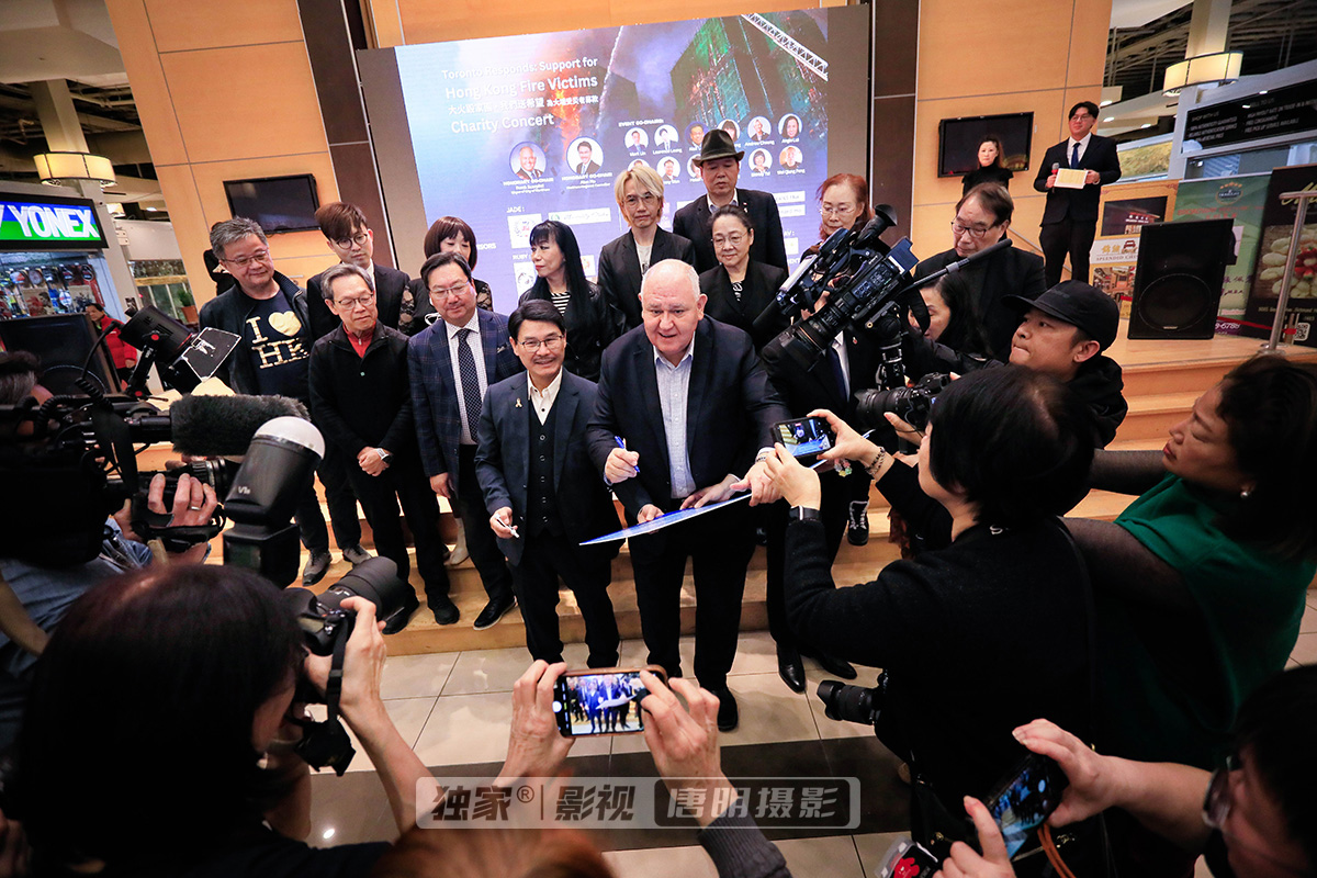 在悲痛中凝聚力量,用行动传递希望-2026年1月11日下午——「大火毁家园 · 我们送希望」为香港大埔受灾者募款慈善音乐会新闻发布会在锦绣中华商场举行,万锦市市长薛家平,万锦市区域议员何胡景及众多嘉宾及社区代表参加了新闻发布会。去年11月,香港大埔宏福苑发生严重火灾,造成 161人不幸遇难(包括1名消防员殉职)、79人受伤,大量家庭瞬间失去家园。噩耗传来,令人深感悲痛,也牵动着海外华人的心。身处海外的多伦多华人社区同样心系家园。在哀悼遇难者的同时,社区各界迅速凝聚力量,以音乐文化交流与筹款行动来表达关怀与支持,展现出守望相助、同舟共济的精神。由多伦多华人社区共同发起的 “Toronto Responds: Support for Hong Kong Fire Victims” 筹款活动已于去年12月正式展开,本次的赈灾慈善音乐会,由万锦市市长薛家平及 万锦市区域议员何胡景携同12位活动联合主席共同推动,透过音乐与行动,为香港大埔火灾受灾者筹集善款,传递希望与温暖。慈善音乐会2026年1月11日(星期日)在锦绣中华商场举行,旨在凝聚社区力量,呼吁社会各界踊跃参与,为受灾家庭送上关怀与支持,本次慈善音乐会有超过100 名慈善者参与超过8小时马拉松表演募款慈善活动。
