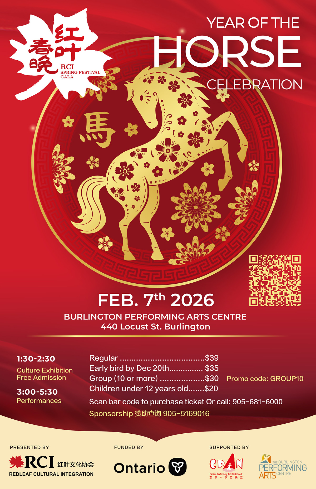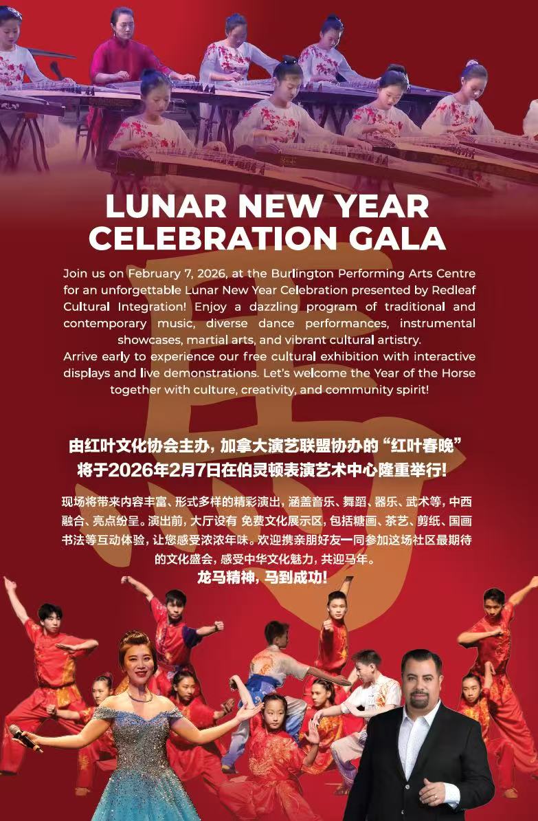 今年的“红叶春晚”将于2月7日,在Burlington 表演艺术中心再次隆重推出。红叶春晚的亮点之一是大厅里丰富多彩的文化展!包括现场做糖画,茶艺,国画书法,工艺美术等各类展示,还有儿童活动,商家展示…. 带着家人孩子,约上亲朋好友一起来体验传统的中国文化,和欢乐的节日气氛吧。春晚的另一个亮点是高质量的文艺演出。本次活动由红叶文化协会主办,加拿大演艺联盟协办,汇集红叶及周边优秀文艺演出团体和个人,精心打造,灯光舞美绚烂,内容精彩纷呈。为您带来一场精美的视听盛宴。