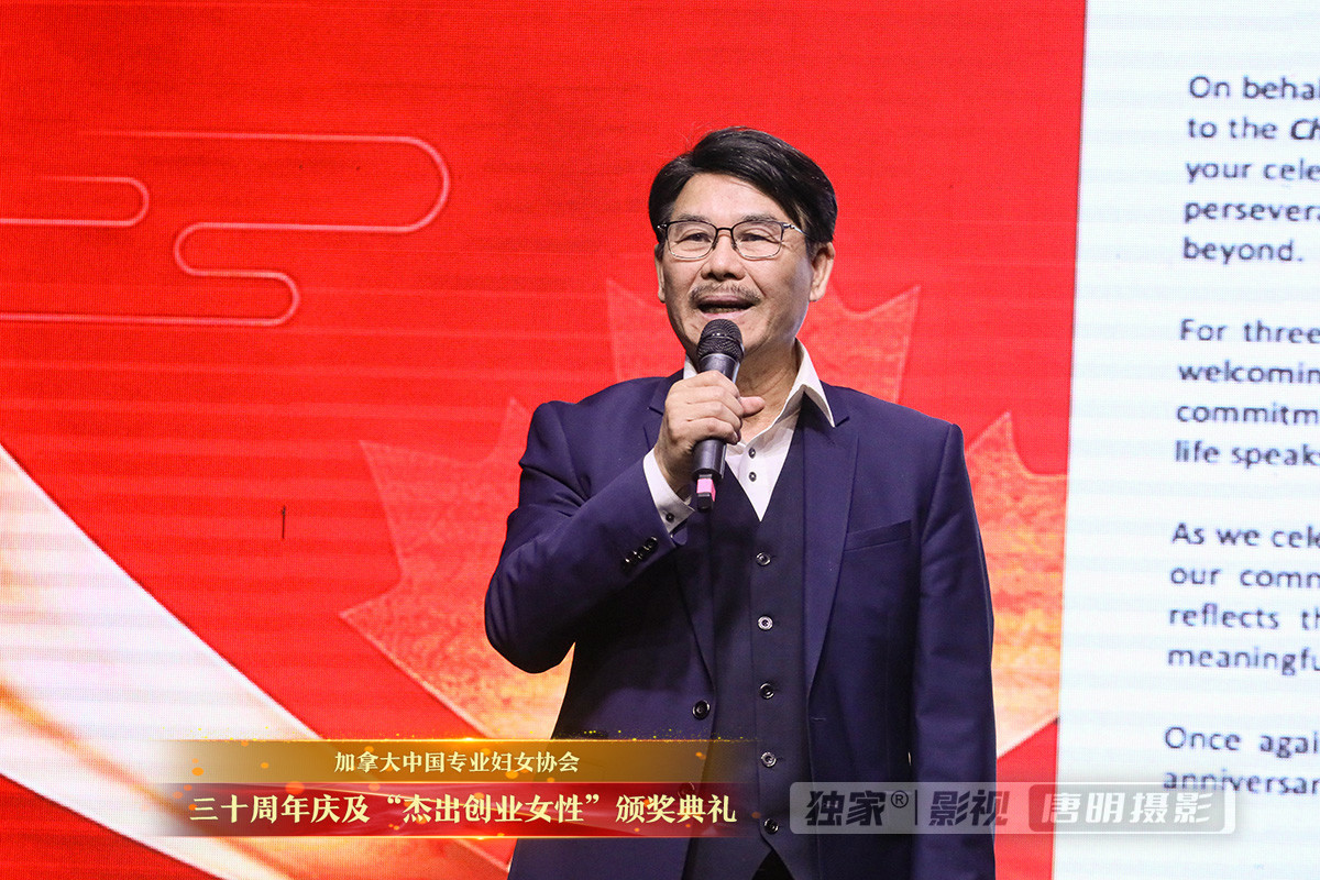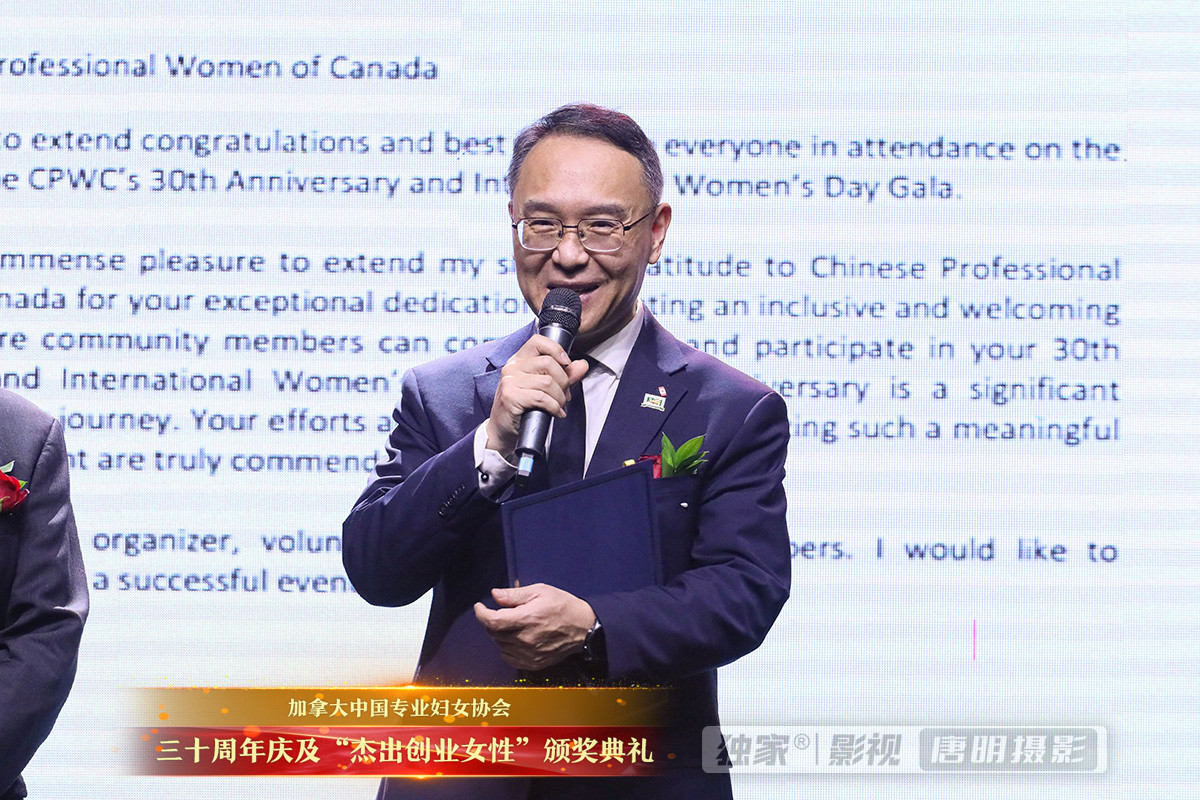 当晚庆典得到了加拿大各级政府和中国驻多伦多总领馆的高度重视与支持,现场政要云集,贺信纷至,共同为协会“庆生”。中华人民共和国驻多伦多总领事馆郭健领事亲临现场并致辞,转达了罗伟东总领事的祝贺。郭健领事肯定了协会三十年来在团结服务侨胞、促进中加友好、支持祖(籍)国发展等方面做出的积极贡献,并寄语协会再创辉煌。联邦国会议员Jean Yip(叶嘉丽)、省议员Kristyn Wong-Tam(黄慧文)、Aris Babikian(白必勤),列治文山市副市长Godwin Chan(陈志辉)、市议员Simon Cui(崔冰辉),万锦市区议员Alan Ho(何胡景)、Joe Li(李国贤),市议员Amanda Yang(杨绮清)、Isa Lee(李思韵)等三级政要先后登台或派代表致辞,纷纷赞扬加拿大中国专业妇女协会三十年来在社区建设、文化传承、女性赋能等方面的卓越成就,并向所有华人女性致以节日的祝福。此外,国会议员Shaun Chen(陈圣源)、市议员Jamaal Myers(麦智谋),省议员Daisy Wai(韦邱佩芳)、Logan Kanapathi(罗庚),列治文山市市长David West,万锦市副市长Michael Chan(陈国治)等也发来贺信,现场滚动播放,祝福满满。