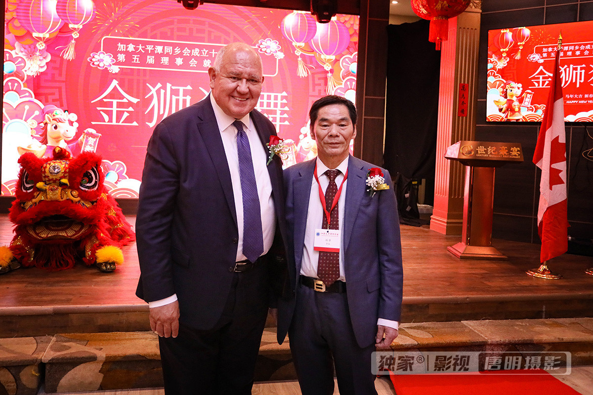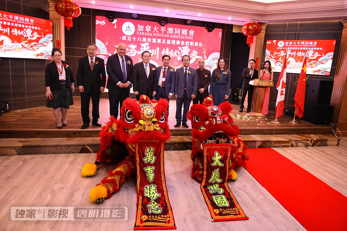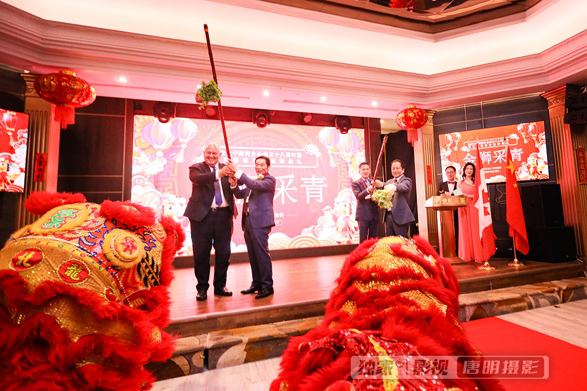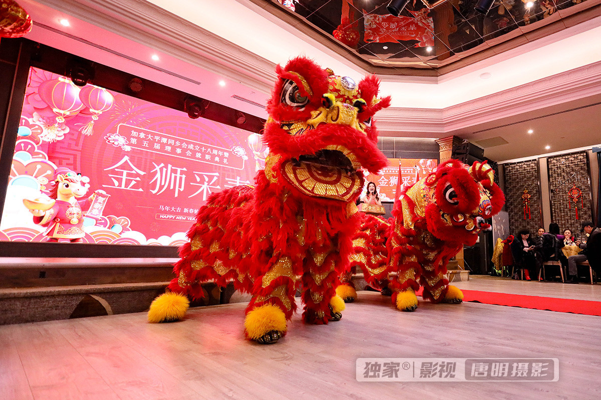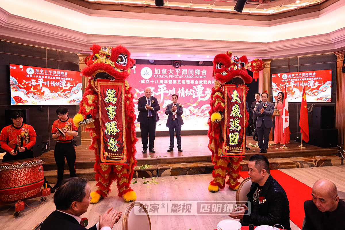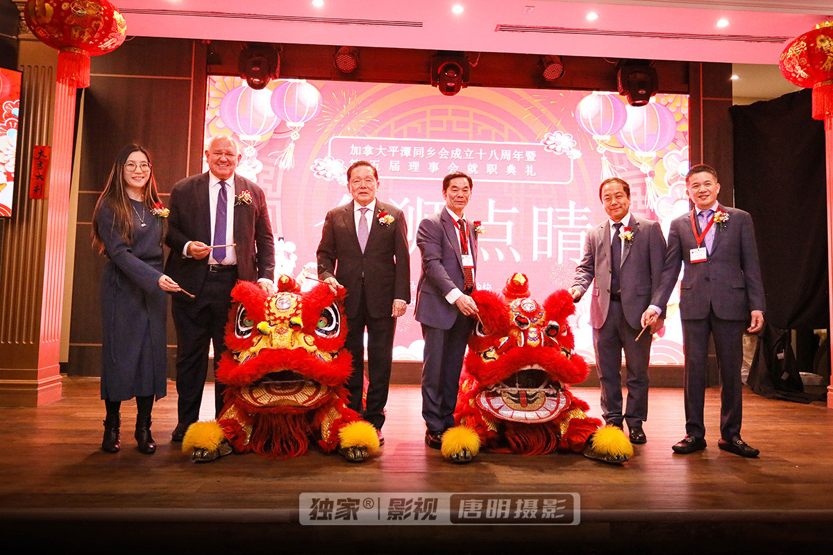 恰逢农历二月二“龙抬头”吉祥吉日,就职典礼上醒狮献瑞启新程。作为中华传统文化精粹,醒狮点睛仪式成为本场盛典的高光时刻。万锦市市长薛家平、前联邦国会参议员胡子修、中国驻多伦多总领事馆张超峰主任、万锦市市议员李思韵、林华会长、翁小斌理事长共同为祥狮点睛。金笔一点,雄狮焕活灵气,寓意同乡会鸿运当头、宏图大展,也寄托着全体乡亲吉祥顺遂、事业兴旺的美好祈愿。点睛后的醒狮腾跃起舞、绕场送福,乡亲们争相触摸狮身,将现场喜庆氛围推向高潮。